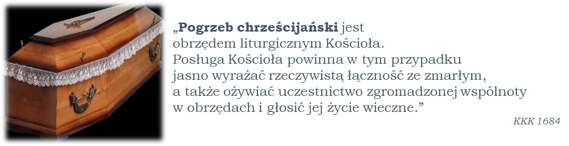Pogrzeb Katolicki jest świadectwem o osobie zmarłej, że była wierząca i mocno związaną ze wspólnotą Kościoła. Nabożeństwo pogrzebowe za każdego wiernego winno być z reguły odprawione w jego własnym kościele parafialnym. Za zgodą jednak proboszcza może być również odprawione poza parafią.